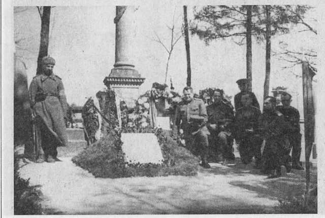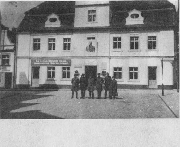 11олковник П.Т. Конаков и его боевые товарищи у дома МИ. Кутузова и памятника в Бунцлау. Апрель 1945 года