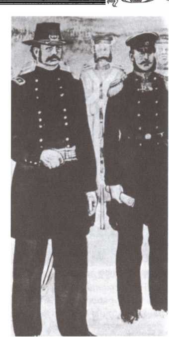 Фрагмент картины, запечатлевшей церемонию передачи Русской Америки. Легко узнаются генерал Л. Руссо и капитан 1-го ранга кн. Д. Максутов. Аляскинская национальная библиотека