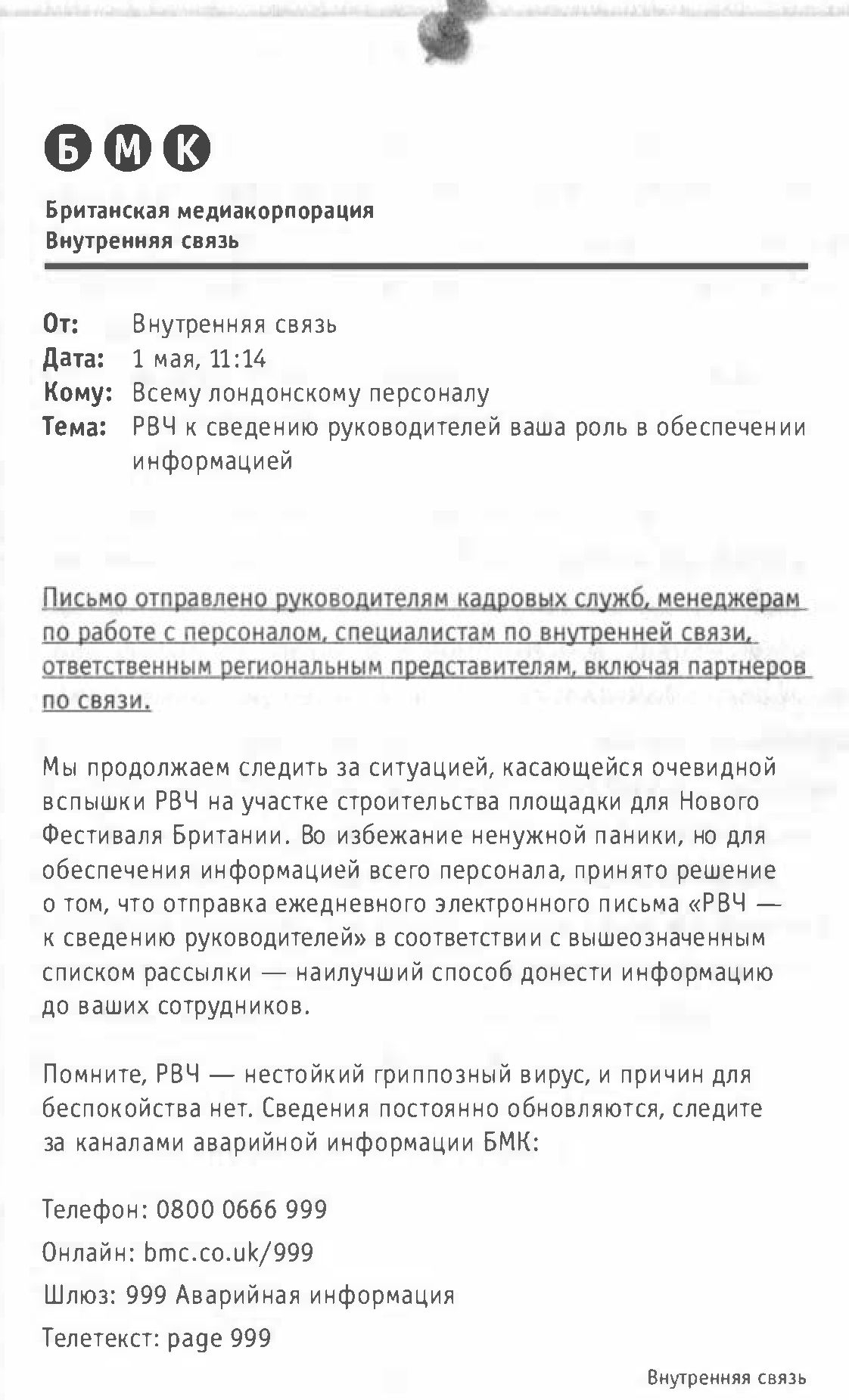 Мы продолжаем следить за ситуацией, касающейся очевидной вспышки РВЧ на участке строительства площадки для Нового Фестиваля Британии. Во избежание ненужной паники, но для обеспечения информацией всего персонала, принято решение о том, что отправка ежедневного электронного письма «РВЧ – к сведению руководителей» в соответствии с вышеозначенным списком рассылки – наилучший способ донести информацию до ваших сотрудников.