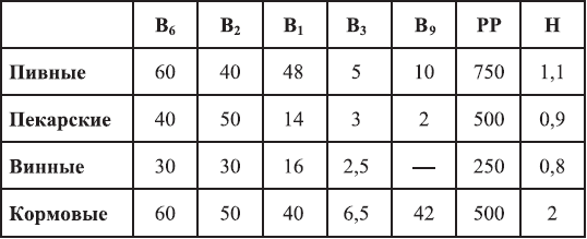 Ниже приводится таблица содержания витаминов группы В в дрожжах (в мг на 1 кг)