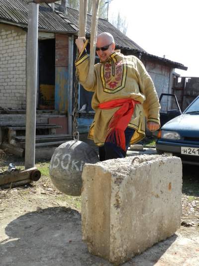 заданным количеством повторений перемещаем отягощение свободного веса, в данном случае, бетонный шар общим весом 150 килограмм (см. фото № 1) усилием мышц правого бицепса в направлении от нижней точки амплитуды движения отягощения Аст (см. фото № 64) к ее верхней точке (см. фото № 65), путем взрывного мышечного ускорения за время, равное одной секунде (1с) и выполняем там его статическое удержание за время, равное одной секунде (1с).