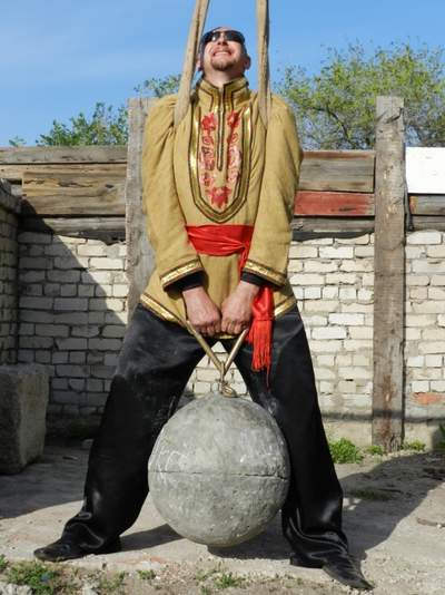 заданным количеством повторений перемещаем отягощение свободного веса, в данном случае, бетонный шар общим весом 150 килограмм (см. фото № 1) усилием трапециевидных мышц спины в направлении от верхней точки амплитуды движения отягощения Аст (см. фото № 122) к ее нижней точке (см. фото № 123), оказывая сопротивление движению отягощения за время, равное трем секундам (3с), а затем перемещаем его в верхнюю точку (см. фото № 124), путем взрывного мышечного ускорения за время, равное одной секунде (1с).