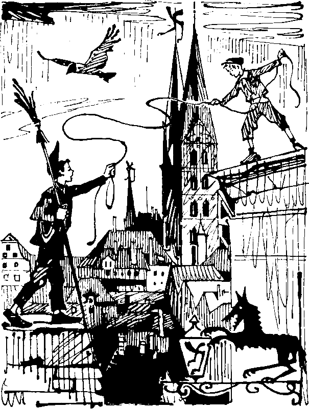 — А теперь, — сказал он, — у меня к вам еще одна просьба. Дайте мне вашу метлу, верёвку и большую ложку.