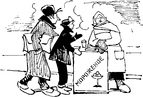 Что касается мороженщиц — не было ничего легче, как опросить их, если бы их не было так много. Они стояли на каждом углу и сердились, что мороженое зимой раскупается хуже, чем летом. Все, как одна, они были сердитые, и это до крайности затрудняло задачу. Их, конечно, тоже можно было понять: мало радости стоять в замерзшем, твердом фартуке на улице в лютый мороз и кричать как на смех: «А вот кому мороженого?» — когда и без мороженого ни у кого зуб не попадает на зуб.