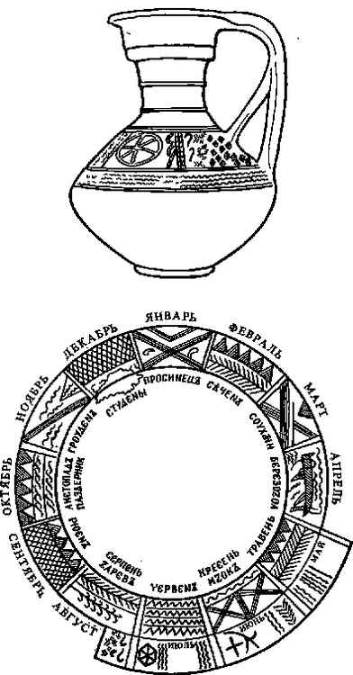 Славянские «календари» для языческих обрядов (Среднее Поднепровье IV в. н. э.). Наверху — кувшин для летних молений о дожде. Внизу — сосуд для новогодних гаданий