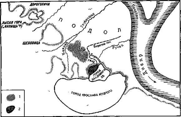 1 — древнейшее местоположение княжеской резиденции в V–VI ев. («Гора Кия» — Замковая Гора, Киселевы); 2 — крепость князя Кия конца V — начала VI в. у Андреевского спуска