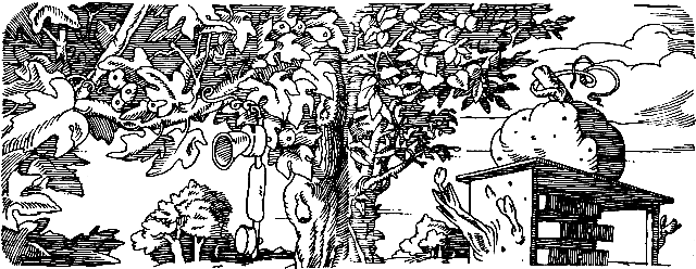 И, взгромоздившись на свой каменный велосипед, он с треском и грохотом, не разбирая дороги, покатил по лесу. Время от времени слышался глухой удар — это Скалоед налетал на толстый ствол огромного дерева. Тогда он скрипел зубами и громко ворчал. Но постепенно шум и гул стихал, удаляясь.
