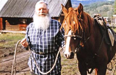 Сам идет в дом, снимаете гвоздя карабин, нюхает пахнущий маслом и порохом ствол, с порога прицеливается в ворону, сидящую обыкновенно на сухом кедре возле сарая, и крикнув, как будто выстрелил, протирает карабин тряпкой, водворяет на место. День проходит в неторопливых хлопотах в огороде, на пасеке, в бане, где сушатся на решетах кедровые шишки. А вечером лошадь приходит домой. Старик не спеша снимает седло, поит коня и, вздохнув, садится на скамейку проводить взглядом уходящее за гору солнце.