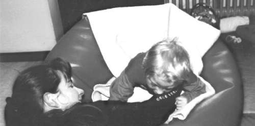Ребенок сидит на боковой стороне U-образной подушки. Когда он играет в таком положении и поворачивает голову к игрушке или перемещает ее на другую сторону, движения головы вызывают у него выпрямительные реакции и реакции поддержания равновесия (рис.4.2).