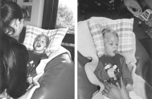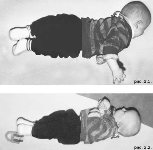 Этот мальчик переворачивается со спины на живот с переразгибанием головы, его ноги остаются вытянутыми и плотно прижатыми друг к другу (рис. 3.1 и 3.2).