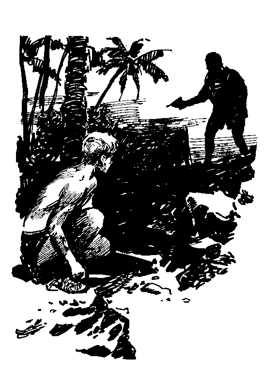 Атолл, омытый ливнем, сверкал в утреннем солнце. Пар курился над влажным еще песком. Переплыв канал, я опять занял свой наблюдательный пост в кустах недалеко от логова Ласкового Питера. Мой противник тоже проснулся, а возможно и вообще не ложился, судя по его усталому лицу. Он сидел за плоским камнем с пистолетом в руке и клевал носом. Иногда он вскидывал голову и ошалело смотрел по сторонам. Он и впрямь считал, что и я поступлю с ним так же, как он хотел поступить со мной: подкрадусь и убью его сонного.