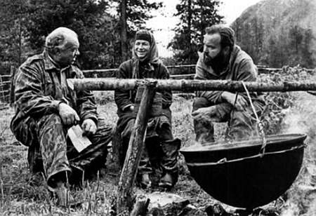 У костра Николай Николаевич Савушкин, Агафья и художник Сергей.