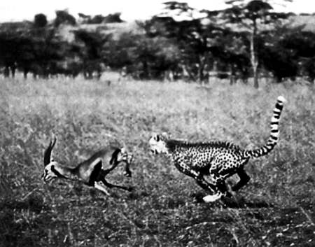 В отличие от леопардов и львов гепард охотится только днем. И потому чаще, чем остальные хищники, оказывается на кинопленке, позволяющей проследить все этапы ловчего бега. Жертвы гепарда такие же резвые бегуны — зайцы и мелкие антилопы. Охотятся гепарды поодиночке и парами, а по мере взросленья детенышей в охоту включается все семейство — кто-то ловит, кто-то учится ловле.