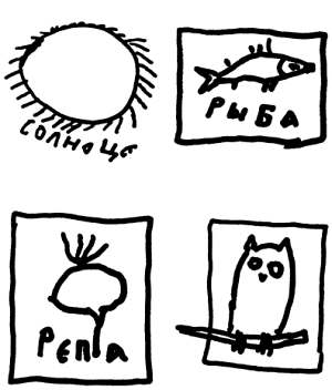 Я попросил Сергея нарисовать все, что нарисовано было Агафьей, и сам тоже изобразил топор, ножницы, репу…