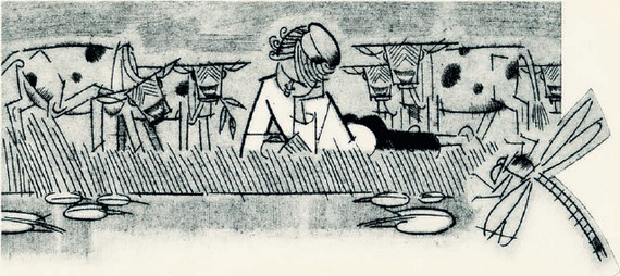 Петя в то время лежал под кустом, а телята – глупые они ещё были – подняли голову, наставили уши и смотрят: что это за старый пень плывёт по реке? А у медведя одна морда торчит над водой. И такая корявая эта морда, что с непривычки не то что телок, а даже человек может принять её за трухлявый пень.