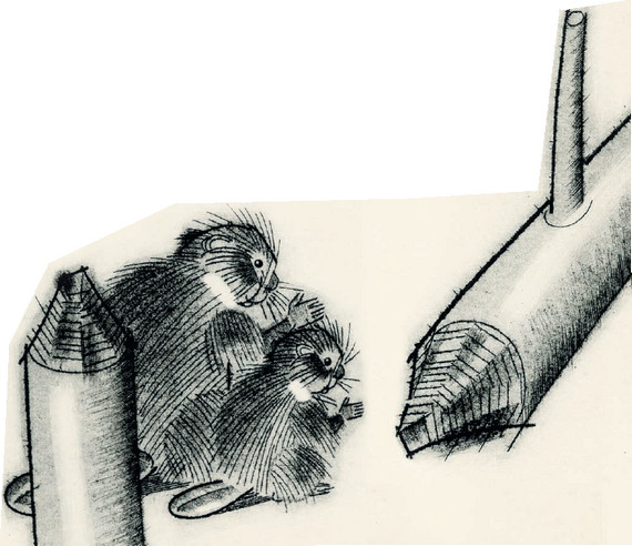Подгрызли ольху, стали на задние лапы и ждут. Медведь плывёт, а бобры смотрят—рассчитывают, когда он подплывёт под самый под удар этой высоченной ольхи. У бобров расчёт всегда верный, потому что они единственные звери, что умеют строить разные хитрые вещи – плотины, подводные ходы и шалаши.