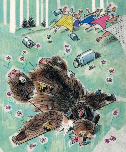 Выскочил медведь на поляну, девушки увидали его – все враз завизжали и так грохнули палками по бидонам, что медведь упал, ткнулся мордой в сухую траву и затих. Девушки, понятно, убежали, только пёстрые их юбки метнулись в кустах.