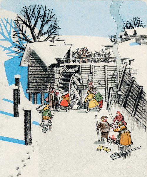 – Я, дедушка Панкрат, – сказал Филька, – как рассветёт, соберу со всей деревни ребят. Возьмём мы ломы, пешни, топоры, будем рубить лёд у лотка около мельницы, покамест не дорубимся до воды и не потечёт она на колесо. Как пойдёт вода, ты пускай мельницу! Провернёшь колесо двадцать раз, она разогреется и начнёт молоть. Будет, значит, и мука, и вода, и всеобщее спасение.