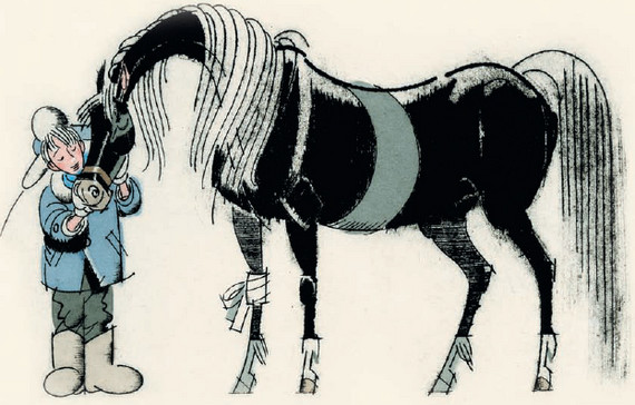 Конь помотал головой, подумал, потом осторожно вытянул шею и взял, наконец, хлеб из рук Фильки мягкими губами. Съел один кусок, обнюхал Фильку и взял второй кусок. Филька ухмылялся сквозь слёзы, а конь жевал хлеб, фыркал. А когда съел весь хлеб, положил голову Фильке на плечо, вздохнул и закрыл глаза от сытости и удовольствия.