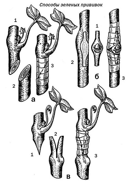 Это самый простой способ прививки, который освоит даже ленивый. Время проведения такого способа – с середины июня до середины августа. Работу проводят утром до 10.00 и вечером после 17.00. В пасмурную, но не дождливую погоду – целый день. Перед началом процедуры с головы куста убирают лишние побеги, а на побегах, оставленных для прививки, очищают лозу от листьев и усиков. На подвое нож ставят ниже глазка на 1,5 см под углом 45° к оси побега, и делают надрез глубиной не более 2 мм. Затем нож переставляют на 1,5 см выше глазка и снимают его скользящим движением вниз до надреза. Вначале такую операцию проводят на подвое, освобождая место для глазка желаемого сорта. Потом таким способом снимают глазок с лозы. Снятый глазок вставляют в вырез подвоя и плотно обвязывают прививку. Обвязку начинают снизу и заканчивают выше верхнего среза, оставляя глазок свободным от пленки. Таким способом на кусте в один год перепрививают все побеги, в том числе отросшие на голове куста, чтобы можно было сформировать 3-5-рукавную систему.
