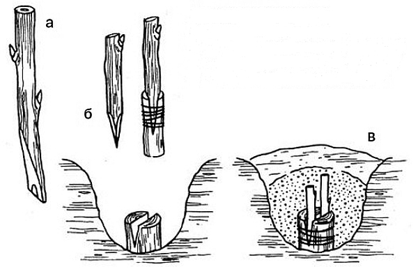 Этим способом перепрививают кусты сортов винограда старше пяти лет. Выполняют эту работу сразу после открытия виноградника. Черенки для прививки должны быть заготовлены с осени. Виноградные кусты освобождают от почвы, стараясь при этом, чтобы земля не осыпалась в лунки. Глубина раскопки головы до 30 см, ширина круга вокруг куста – 60–70 см. Приготовленные черенки проверяют на жизнеспособность, замачивая их в воде. Голову куста в удобном месте штамба спиливают ножовкой, а срез зачищают острым ножом. Затем готовят одно– или двухглазковые черенки, которые в процессе подготовки держат в баночке с водой. Расщепляют ствол специальным топориком для перепрививки, но можно топором или стамеской. Лучше всего черенки готовить с двойными плечиками. В зависимости от толщины штамба ставят от двух и более черенков. При этом очень важно обеспечить совпадение камбиальных слоев подвоя и привоя, т. е. кора привоя с наружной стороны должна совпадать с корой подвоя. Затем проводят обвязку привитых черенков, следя за тем, чтобы в рану не попала земля. Если компоненты не очень толстые, обвязывают полиэтиленовой пленкой. Если же крепости пленки недостаточно, то прививку стягивают вначале пеньковым шпагатом, потом пленкой. Затем срез замазывают садовым варом, сверху надевают бумажный колпак с отверстиями для черенков и засыпают лунку землей. Через 20–30 дней шпагат и пленку аккуратно разрезают, а привитые растущие черенки подвязывают к колышку, чтобы они не обломились.