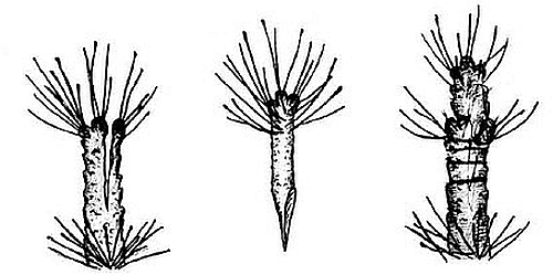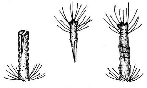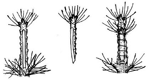 Как заготавливают черенки с пяткой. Известно, что заканчивающие рост боковые и верхушечные почки к концу вегетации растут очень медленно. В них накапливается много питательных веществ, а вокруг еще закладывается много резервных спящих почек. Практикой питомниководов, как плодоводов, так и лесоводов, установлено: когда заготавливаешь черенки для окоренения, лучше окореняются те из них, у которых есть часть двухлетней древесины. Поэтому они, в зависимости от породы, а также от материала, с которого берут черенки (нарезанные ветки, живое дерево), по-разному их режут. Так, по осени, когда опадет лист на заокулированных подвоях 1-го поля питомника, заготавливают однолетние черенки с кусочком старой древесины. С каждого подвоя можно заготовить 1–3 черенка. При этом, чтобы не погиб заокулированный глазок, выше глазка оставляют пенек, шип с боковыми веточками длиной 10–15 см, а остальное срезают и из них нарезают черенки с пяткой. Так я делаю на подвоях яблони АРМ-18 и 62-396, на подвое груши ВА-29. Заготовленные черенки должны иметь пяточку 0,5–1 см двухлетней древесины и однолетний побег диаметром от 0,6–1,2 см длиной 25–35 см. На зиму черенки лучше хранить в погребе, в песке или опилках.