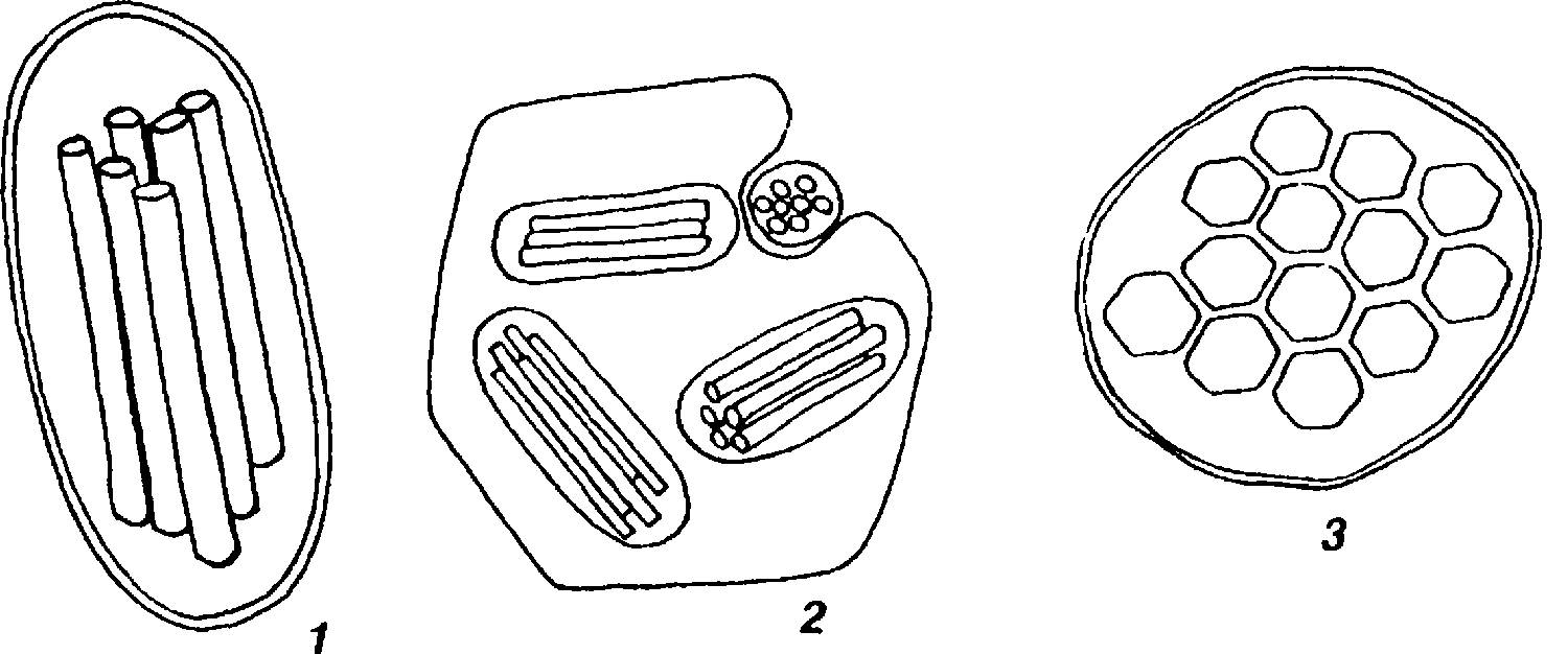 1 – пучки палочковидных частиц вируса ядерного полиэдроза, завернутые в оболочку; 2 – строение полиэдра: пучки вирусных частиц погружены в глыбку из вирусного белка; 3 – ядро клетки жирового тела гусеницы, набитое полиэдрами