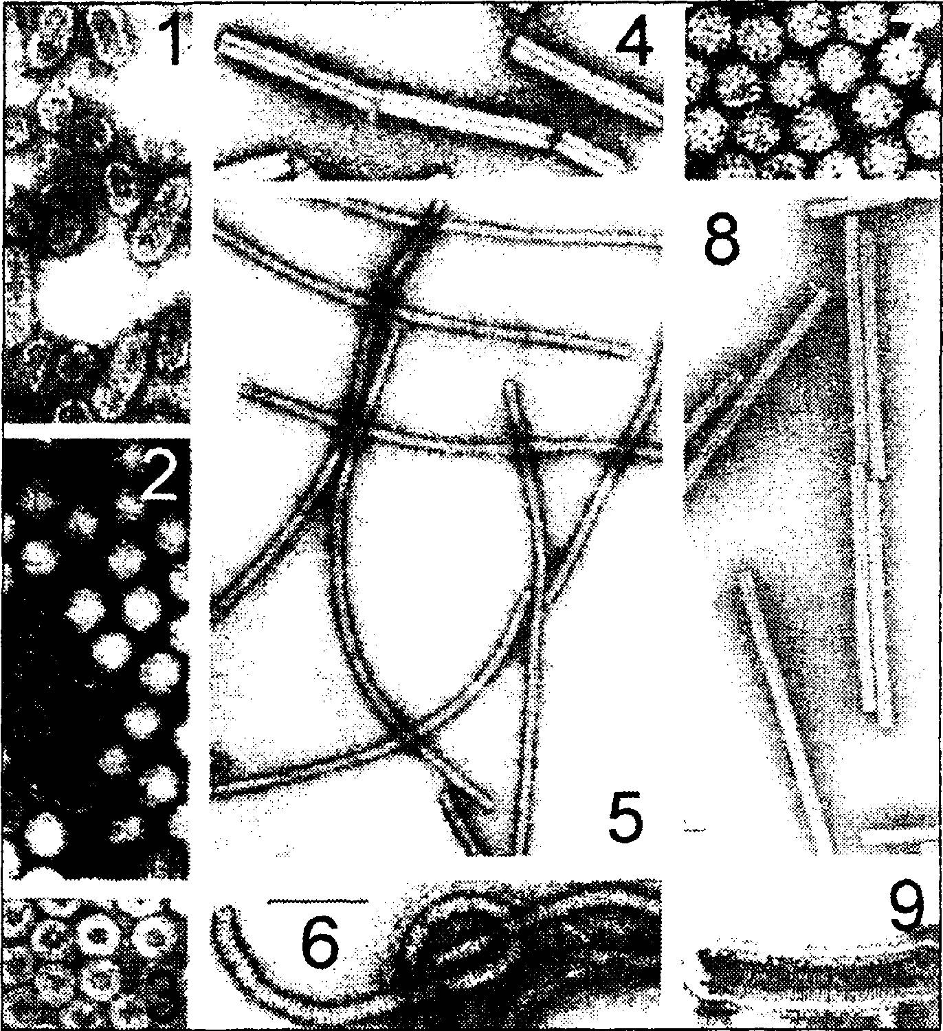Так выглядят под электронным микроскопом некоторые вирусы растений. 1 – Вирус мозаики люцерны. Вирус один, а частицы разные. 2 – Вирус кольцевой пятнистости малины. Многие вирусные частицы пустые. 3 – Вирус мозаики цветной капусты. 4 – Вирус погремковости табака – короткие и длинные палочки. Хорошо виден внутренний канал. 5 – Нитевидные частицы вируса М картофеля. 6 – Нитевидные частицы вируса желтухи свеклы. Хорошо видна поперечная исчерченность вирусной частицы. 7 – Вирус кустистой карликовости томатов. 8 – Палочковидные частицы вируса табачной мозаики. 9 – Рабдовирус морщинистости земляники.