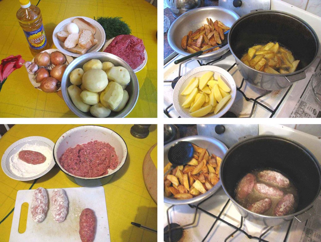 К моменту, когда весь картофель будет обжарен и выложен в широкую миску, у вас уже должен быть готов фарш. Нам остаётся слепить из него продолговатые «колбаски», массой приблизительно по 130 г. Для этих целей следует заранее подготовить мисочку с мукой (100 г), смешанной с 1 чайной ложкой соли. Смочив слегка руку под струёй тёплой воды, набираем немного фаршу (130 г) и, прихлопывая, формируем из него полуфабрикат. Затем обваливаем его хорошенько в смеси из муки и соли и укладываем на разделочную доску или сухую тарелку. Когда подобных изделий наберётся штук 5 – 6, убавляем пламя под казаном почти вполовину и опускаем туда жариться наши заготовки. Необходимо выждать некоторое время (5 минут), а затем осторожно постараться повернуть их обратной стороной и снова подождать примерно столько же. Пока первая партия «колбасок» жарится, мы подготавливаем вторую. Лично у меня получилось в общей сложности десять с половиной котлеток. Таким образом, я обжарил в два этапа (по 5 котлеток в каждом) все полуфабрикаты. И ушло у меня на это по 10 минут на каждую партию. То есть, всего 20 минут.