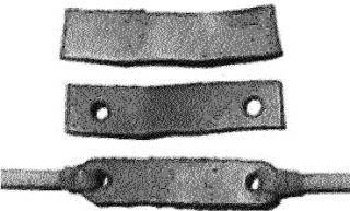 Для изготовления кожетка понадобится прямоугольный кусочек кожи шириной 18 мм и длиной 6–7 см (он может быть шире и больше, если того требует вид используемых зарядов). На каждом конце проделывается дырка 9 мм, как показано на рисунке 4–3. Проделать ее можно дрелью, зажав кожеток между двумя деревянными брусками и просверлив их насквозь. Еще ее можно пробить канцелярским дыроколом.