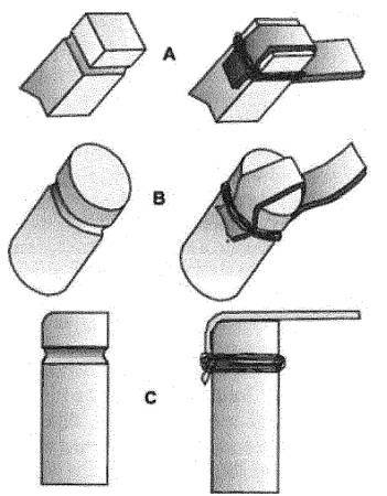 При использовании техники, показанной на рисунке 4–4 "A" и "В" нить имеет тенденцию врезаться в тяжи и повреждает их. Способ "С" , где тяжи крепятся лишь к одной стороне рога, уменьшает эту проблему, но в этом случае их придется каждый раз аккуратно укладывать на свои места при каждом выстреле.