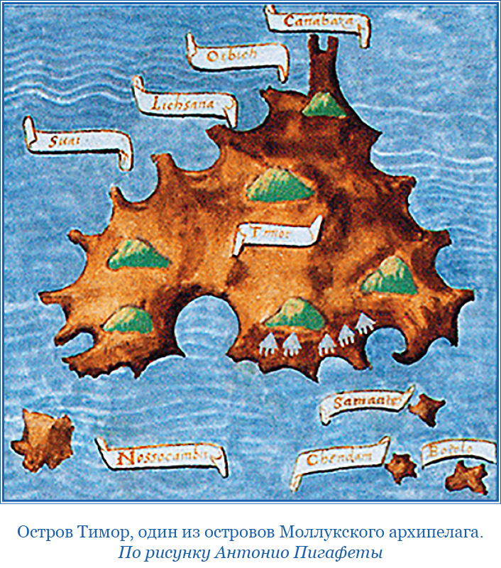 Между тем на целых два года следы Магеллана теряются. Арагонский историк XVI в. Архенсола сообщает, что Магеллан побывал на каких-то островах, расположенных в 600 лигах (т. е. около 3000–3500 км) от Малакки. Будучи там, он переписывался с Серраном, который якобы звал его к себе на остров Тернате.