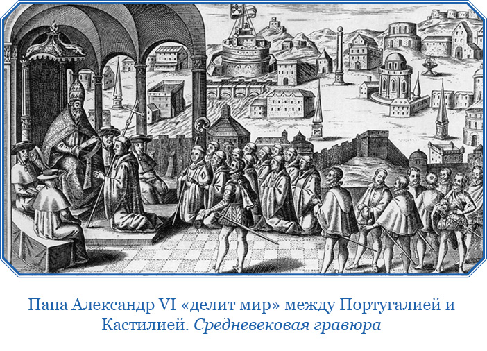 Сложная и запутанная игра, в которой активное участие принимали как искушенные в дипломатических интригах царедворцы, так и организаторы заморских экспедиций, велась и в Лиссабоне, и в Риме, и в постоянно меняющихся резиденциях кастильских королей. В ее истории нашла отражение борьба португальских и кастильских рыцарей первоначального накопления за вновь открытые источники сказочной наживы, за торговые пути в земли Гвинеи и богатейшие страны Южной Азии.