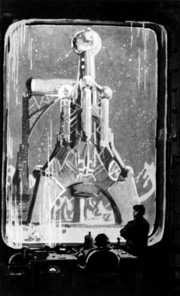 Серп Земли заглядывает через острые вершины скал в долину и своим голубовато-белым сиянием пытается затмить свет заходящего Солнца. В этом удивительном освещении могучий корабль производит впечатление сказочного чудовища. Своими очертаниями он напоминает великана, который с гордо поднятой к звездному небу головой ждет мгновения, когда, опираясь на конструкцию, что поддерживает его тело, оттолкнется и устремится прямо в безграничную Вселенную. Какими же крошечными, по сравнению с ним, выглядят люди в скафандрах, которые возятся возле кранов; какой маленькой кажется сейчас вся Земля!
