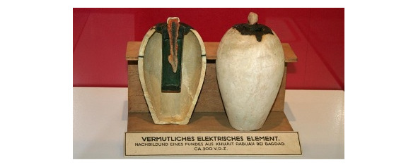 Для полноты картины о начальных сведениях по электричеству и магнетизму упомянем об одной археологической находке — т. н. «багдадской батарейке». Эту «батарейку» при раскопках в районе Багдада в 1936 г. нашел австрийский археолог Вильгельм Кёниг, в 1940 г. в Вене он опубликовал книгу о своей работе «Im verlorenen Paradies: 9 Jahre Irak». Артефакт, который нашел Кёниг, при большой фантазии можно принять за гальванический элемент — проводившиеся опыты с макетом «багдадской батарейки» закончились получением от нее напряжения 0,8–2,0 В. Дата изготовления «багдадской батарейки» условно относится к 3 веку до н. э. Скептики считают, что представленный Кёнигом артефакт имеет другое назначение — например, это сосуд для хранения свитков рукописей (к слову — традиционно по всем интересным археологическим находкам высказываются скептики, например, «золото Трои», которое нашел Шлиман, они считают «новоделом», сделанным «в Одессе на Малой Арнаутской» и т. д.). Артефакт Кёнига представлен в Техническом музее в Вене [5].