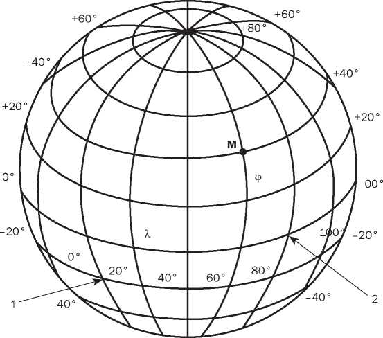 Рис. 4. Географическая система координат: 1 – Гринвичский меридиан; 2 – экватор