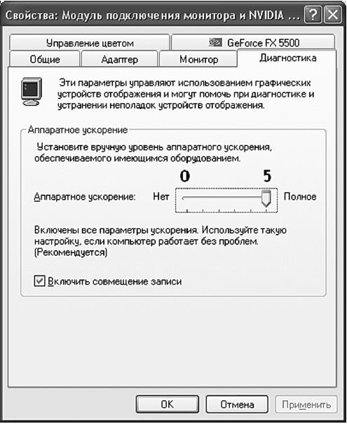 В положении 0 (нумерация с нуля) аппаратное ускорение полностью отсутствует. Ползунок в этом положении находится, когда Windows загружен в безопасном режиме или при проблеме с драйвером монитора, видеокарты или DirectX. Если Windows запущена в обычном режиме, а аппаратное ускорение задействовать не получается, нужно переустановить драйверы видеокарты и монитора, а также обновить DirectX. [10]