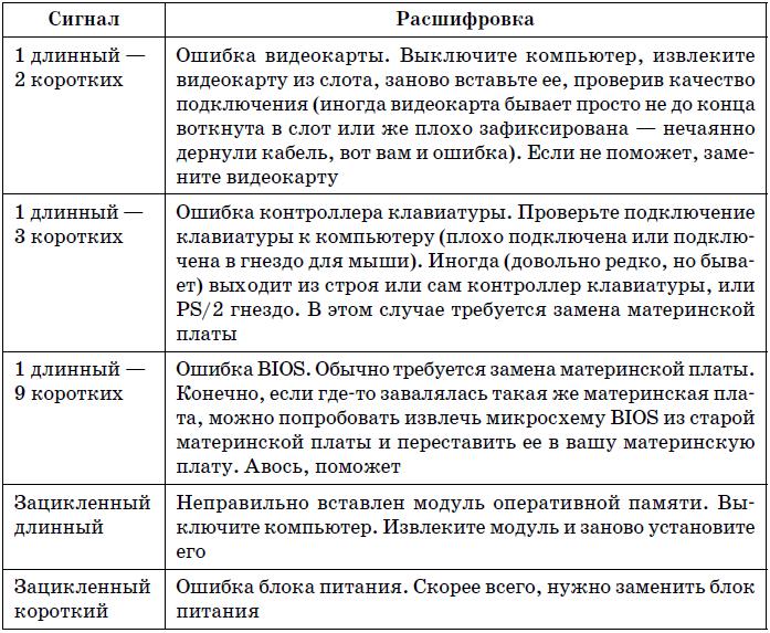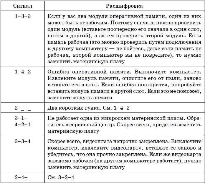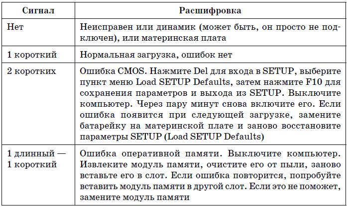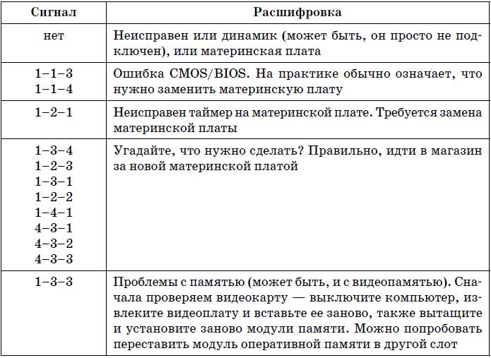 Иногда после включения питания компьютер начинает пищать. Это явный признак аппаратной ошибки. Количество сигналов и их последовательность зависит от базовой системы ввода/вывода (BIOS, Basic Input/Output System). Обычно версия и производитель BIOS выводятся на экран при загрузке компьютера. Но в некоторых случаях на экран ничего уже не выводится (например, проблема с оперативной памятью или с видеокартой), а вы до появления этой ошибки не обращали внимания на версию или производителя BIOS. В этом случае узнать производителя BIOS можно в руководстве по материнской плате или же по надписи на чипе BIOS на самой материнской плате. Сегодня можно встретить BIOS производства следующих компаний: AWARD, Phoenix, AMI. Кодировки звуковых сигналов для BIOS этих производителей приведены в табл. 19.1, 19.2, 19.3 соответ ственно.