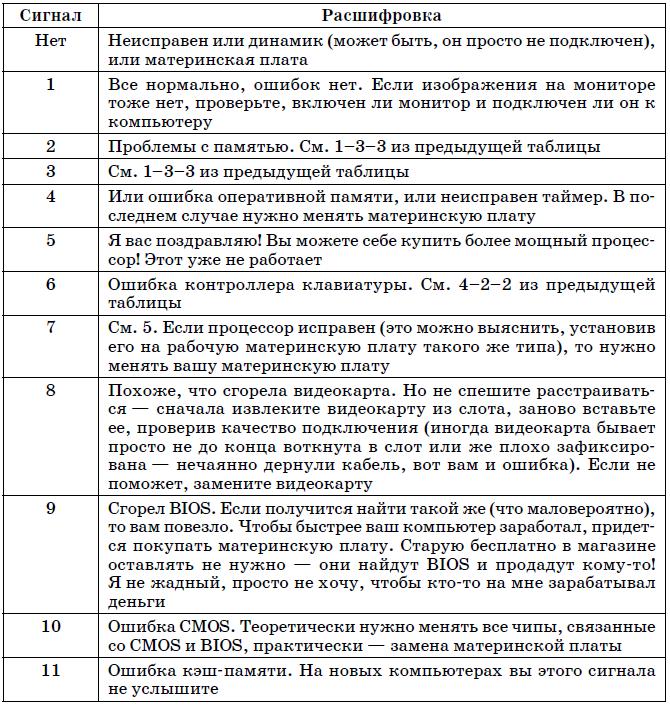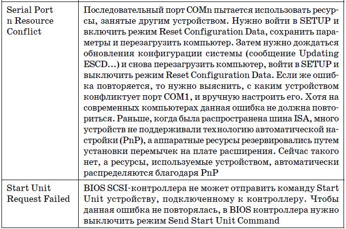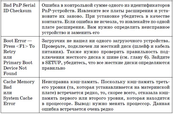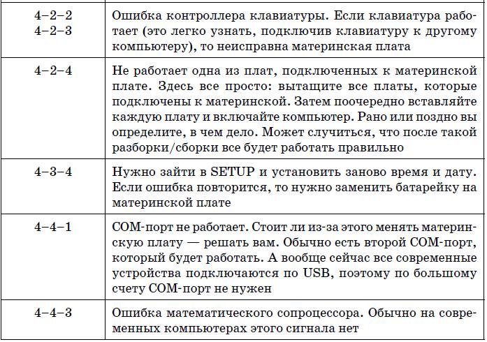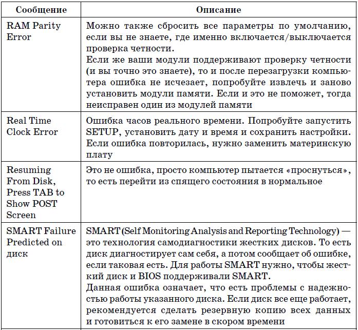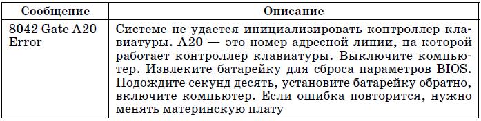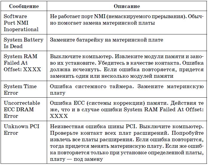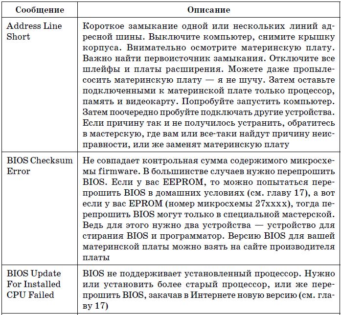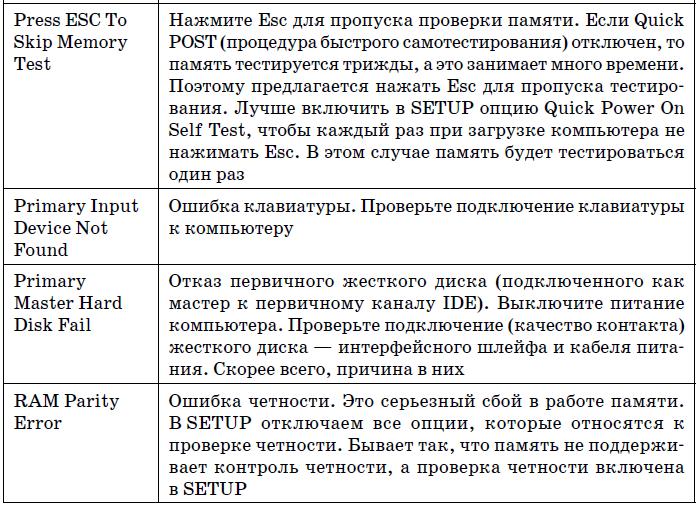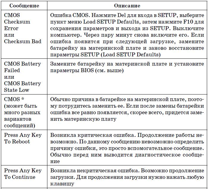 В табл. 19.4 указаны наиболее часто встречающиеся текстовые сообщения BIOS. На этот раз дифференциации по производителям BIOS не будет, поскольку по текстовому сообщению можно понять суть ошибки, а она будет одна и та же, вне зависимости от версии BIOS.