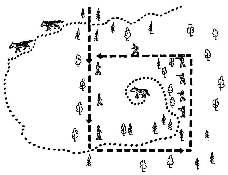 Успех облавной охоты на волков в большой степени зависит от опыта охотников, их умелых, слаженных действий, предварительной подготовки. Зимой охотиться таким способом довольно трудно. Дело в том, что в зимний период индивидуальный участок обитания волчьей семьи очень велик. Волкам не так-то просто добыть себе пропитание, поэтому на поиск пищи они могут уходить от дневной лежки на очень большие расстояния. Подсчитано, что зимой волчья стая от места подъема со старой лежки до места нового убежища может пройти от 15 до 70 км. В тундровой зоне эти расстояния еще больше, случалось, за день волки преодолевали до 150 км. Что же заставляет волка покрывать такие огромные расстояния? Чаще всего это невозможность добыть себе пропитание. Длина суточного хода зависит также от глубины и рыхлости снега, местности, наличия проезжих дорог. Но следует знать, что в зависимости от размеров своего индивидуального участка волки посещают места своих дневок раз в 3–10 дней.