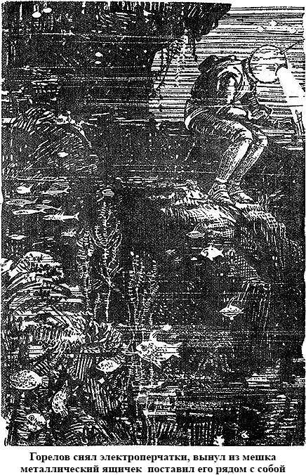 Горелов заметил на ней отдельно стоявшую скалу с углублением вроде просторной ниши. Пустив в ход внутренний механизм воздушного мешка, он загнал обратно в патрон кислород и сел на небольшой обломок скалы. Когда поднятая им туча ила рассеялась и вода вокруг приобрела свою обычную чистоту и прозрачность, Горелов снял электроперчатки, вынул из мешка металлический ящичек, взятый из пишущей машинки, и, выбрав ровное место на обломке, поставил ящичек рядом с собой. Потом приладил к нему длинные тонкие детали, и ящичек получил вид странного морского ежа с растопыренными во все стороны необычайной формы иглами.