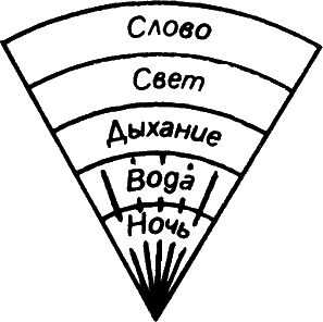 Над Водами было мощное Дыхание элохимов (творящих дхиан-коганов). Над Дыханием появился Свет, и над Светом – Слово... которое его сотворило.