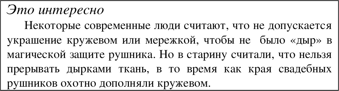 На русской свадьбе использовалось большое количество рушников: вы увидите это, читая книгу. Из них самые важные: