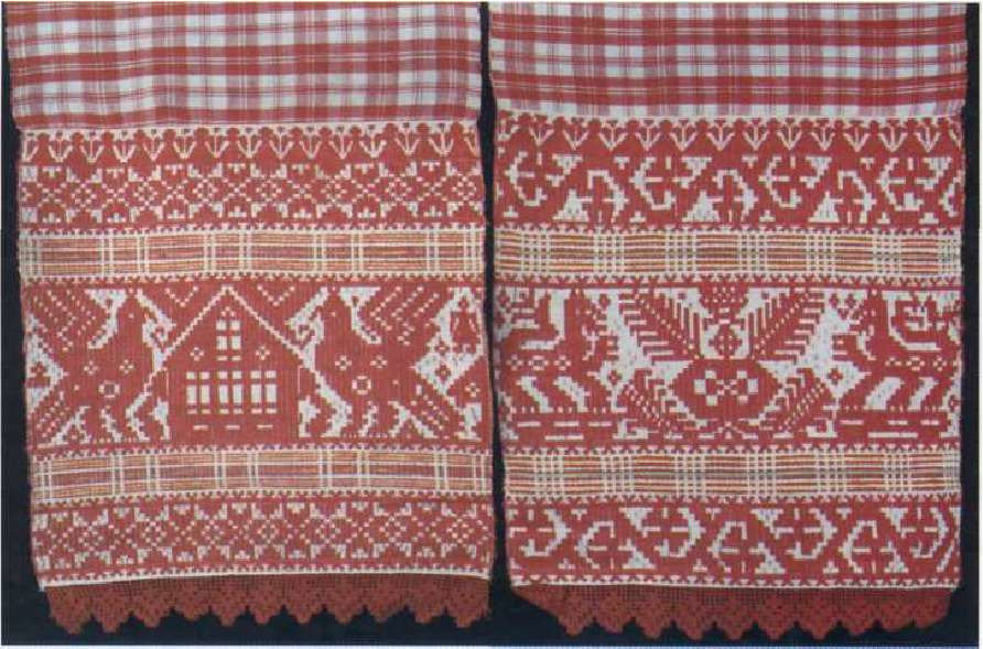 Концы свадебного рушника. XIX век. Сокольский район Вологодской обл. 3 С одной стороны рушника – пара птиц возле дома в окружении статичных цветочных рядов, с другой – звери возле «Великой Матери» в окружении динамических солярных (т. е. изображающих солнце) узоров.