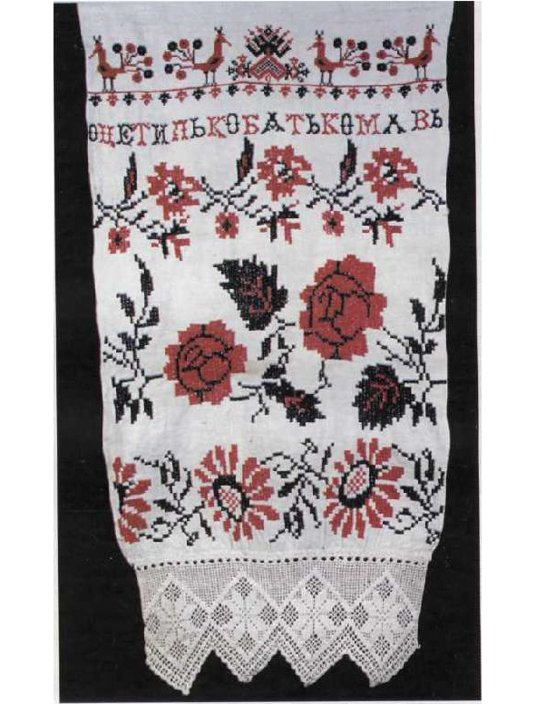 Конец свадебного рушника. XIX век. Бабушкинский район Вологодской обл. 5 Это пример начала утраты традиции. Крупным планом изображены модные в то время цветы. Традиционные мотивы показаны мелко: это поле с ростками – символ плодородия («Великая Мать» и птицы)
