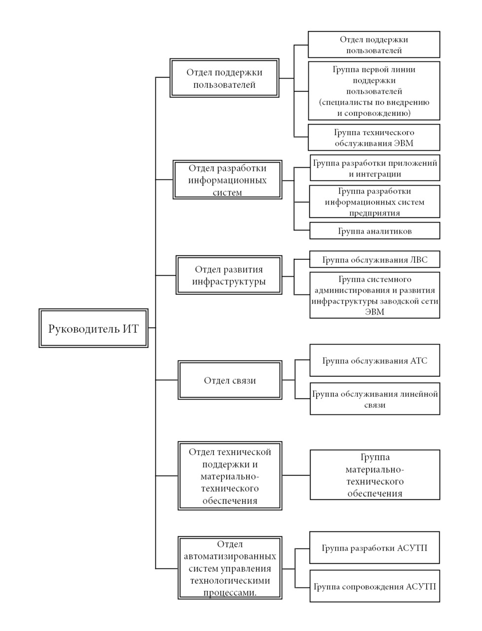 Но эта структура не является типовой, т. к. мы в самом начале вводили некоторые ограничения. Так, например, на основе ограничения в численности сотрудников предприятия более 1001 человек, с применением метрики для определения численности ИТ-специалистов (3,5 %, см. раздел) получаем, что численность ИТ-подразделения должна быть в районе 35 человек. Конечно же, определенная нами численность является ориентиром и для более точного расчета руководство ИТ подразделения должно владеть дополнительными параметрами, например: численность парка персональных компьютеров; количественный и качественный состав периферийной техники; количество абонентов АТС; количество объектов Автоматизированной Системы Управления Технологическим Процессом (далее по тексту – АСУТП); объем и качество (доморощенные системы или готовое комплексное программное обеспечение) программных ИТ-сервисов; сколько и каких моделей картриджей тратится предприятием за период и т. п.
