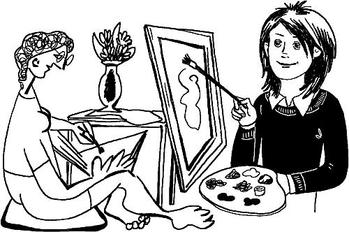 На рисунке я позирую, а Рассел стоит с палитрой в руке. Похоже на картину Пикассо, которую нам показывал мистер Виндзор, правда у Пикассо натурщица обнаженная – но не стану же я изображать себя в чем мать родила. Если уж быть совсем точной, художник у Пикассо тоже без одежды, но, само собой, я не буду рисовать Рассела нагишом. Интересно, а какой он голый, вдруг мелькает у меня в голове, и я мигом заливаюсь краской.