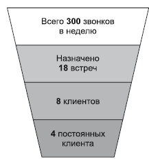 1. Измеримые продажи. Вы точно знаете, сколько клиентов в среднем приходит к вам ежемесячно – ведете замеры, исходя из количества действий отдела активных продаж. Другими словами, вы знаете и считаете свою воронку продаж. Например, вы знаете, какое количество звонков дает определенное количество сделок, средний чек своего клиента – и все это ведется системно. Есть и цифры конверсии. Например, отдел активных продаж делает 300 исходящих звонков в неделю, по которым назначается 18 встреч, из них по итогам восемь компаний становятся клиентами (средний чек первой сделки – 24 380 руб.), причем четыре – постоянными (рис. 3.1).