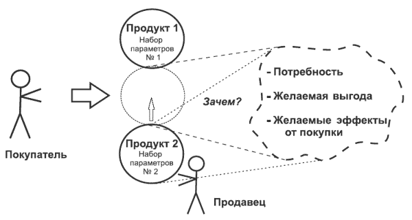 Считайте, что это схема некой «перевербовки» покупателя на сторону вашего товара.