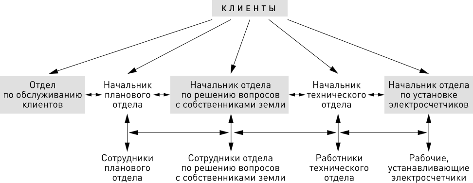 Прежде чем мы займемся подробным изучением организации работы персонала, состоящего сплошь из профессионалов, давайте посмотрим, какое значение это будет иметь для клиентов компании. Приведем в качестве примера британскую энергетическую компанию, которой долго не удавалось сократить сроки подключения новых домов к электросетям. Старый процесс начинался тем, что застройщик звонил в офис компании, а оттуда его направляли в отдел по обслуживанию клиентов. Представитель этого отдела заполнял заявку на подключение электроэнергии, в которой указывал местоположение объекта и другие подробности. Заявка передавалась начальнику планового отдела, он поручал одному из своих подчиненных составить план проведения кабеля к зданию от ближайшей подстанции. Затем этот план передавали в отдел, занимающийся решением вопросов с собственниками земель, по которым планировалось проложить кабель. Сотрудник отдела направлялся к землевладельцам и договаривался с ними. После получения всех необходимых разрешений план передавали начальнику технического отдела, он назначал бригадира, который затем собирал в бригаду рабочих с нужной специализацией. Бригадир также следил за правильным выполнением проекта, начиная с приобретения кабеля и заканчивая проведением электричества до розеток и выключателей. Только после этого план достигал отдела по установке электросчетчиков. Начальник отдела посылал своих работников на место, они подключали дом и устанавливали счетчики для измерения потребления электроэнергии. Обычно на все это уходило около полугода.